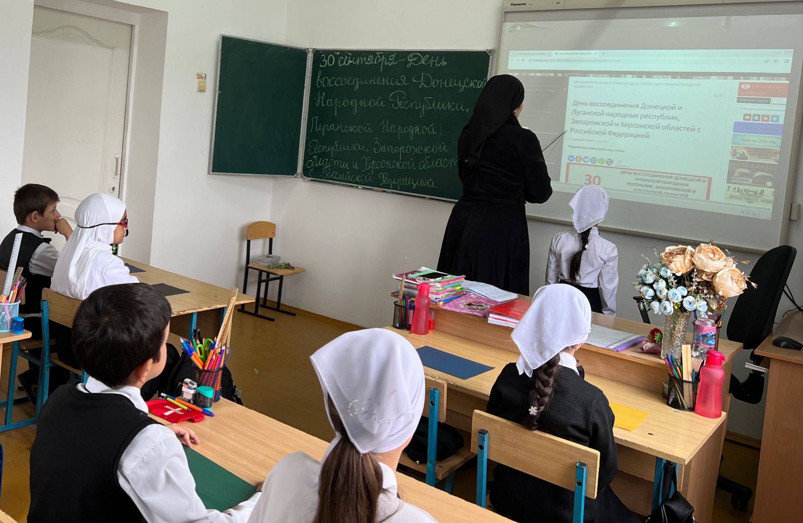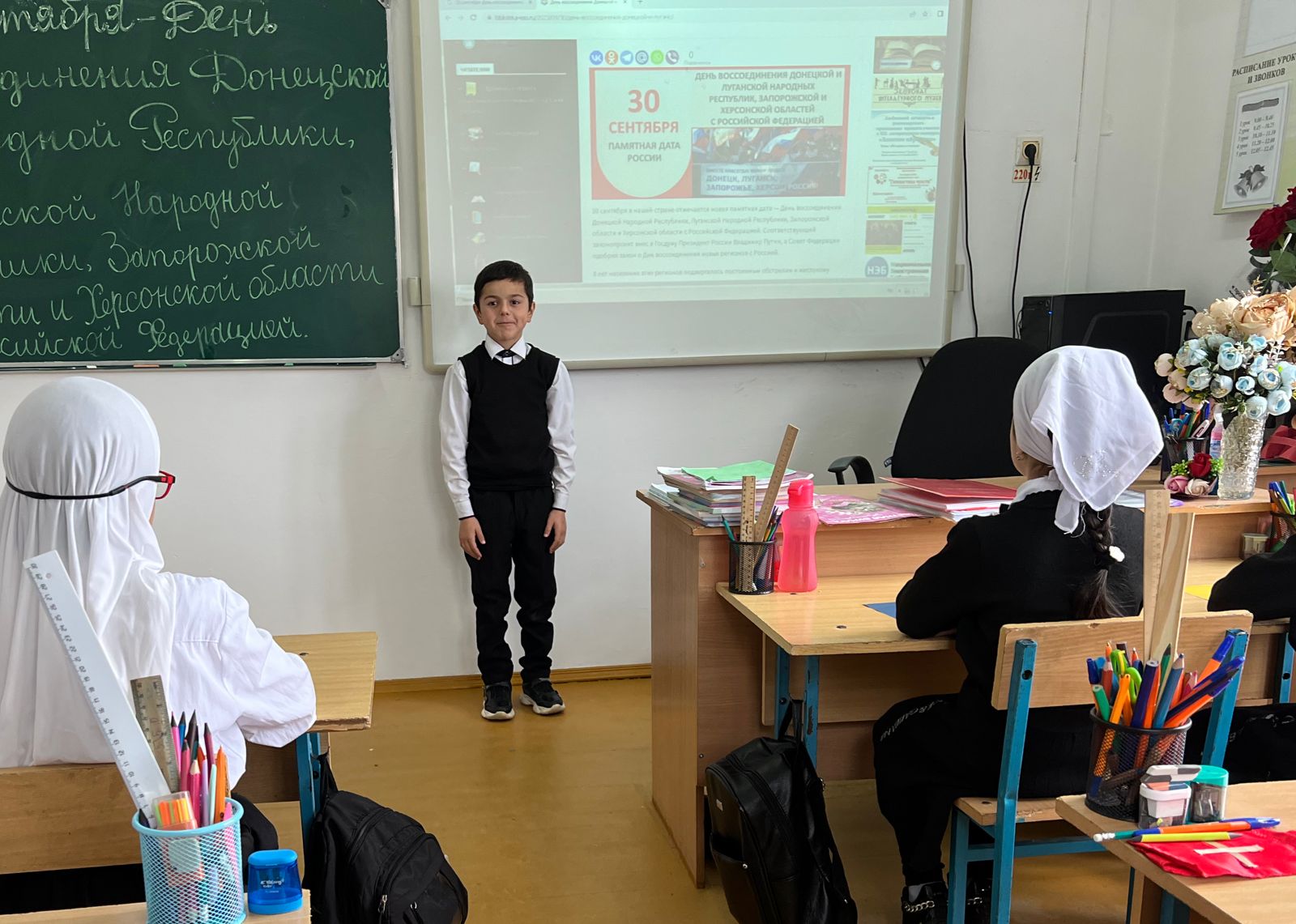 В МБОУ «НОШ с.Денги-Юрт» при взаимодействии с отделом УФСБ России по Чеченской Республике в Ножай-Юртовском районе проведен урок, приуроченный к этой дате. На уроке ребятам рассказали о новом для нашей страны празднике, который отмечается 30 сентября, о том, что дата приурочена к подписанию 30 сентября 2022 года Президентом России и главами ДНР, ЛНР, Запорожской и Херсонской областей договоров о включении новых территорий в состав РФ. Ребята узнали, что это событие основано на исторической общности народов, проживающих на территориях указанных республик и областей, является результатом волеизъявления миллионов людей, реализации ими неотъемлемого права свободно и без вмешательства извне определять свой политический статус и осуществлять свое экономическое и социальное развитие.
